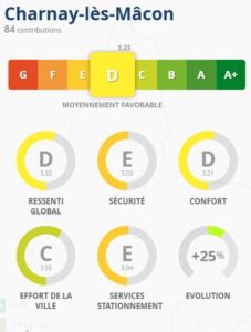 Charnay est 1ère dans sa catégorie en termes de progression (+25%) par rapport au baromètre précédent de 2021. Cette évolution témoigne d’un changement important dans la prise en compte des mobilités actives et en particulier du vélo dans la politique de la municipalité. La ville part de loin puisqu’en 2021 elle était notée F. A l’issue du baromètre 2025, sa note est de D. Mâcon vélo en ville espère que cet engagement en faveur d’une ville durable en termes de mobilité va se poursuivre.