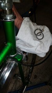 - On a enlevé les roulements à billes des potences pour bloquer la roue avant.