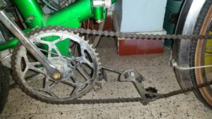- Pose de la chaine du dérailleur. Elle a tout de même un demi maillon de trop. Il va falloir trouver une solution pour ajuster la tension de la chaine